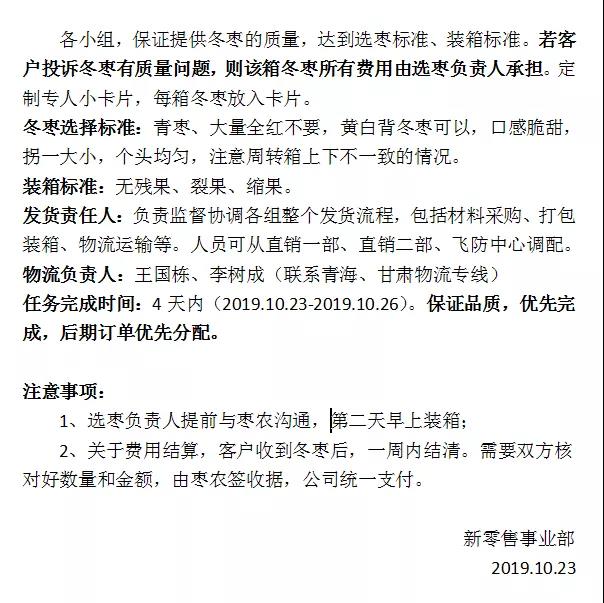 分工協(xié)作加上同事們高昂的工作勁頭,極大地提高了工作效率,歷時三天,萬箱經(jīng)過層層篩選的冬棗順利發(fā)出。物流承載的不僅僅是棗,更是新零售事業(yè)部全體人員的努力付出,在這三天里,有同事早晨來不及吃早飯,只能擠出時間吃個包子,公益服務(wù),卻也視為責(zé)任!